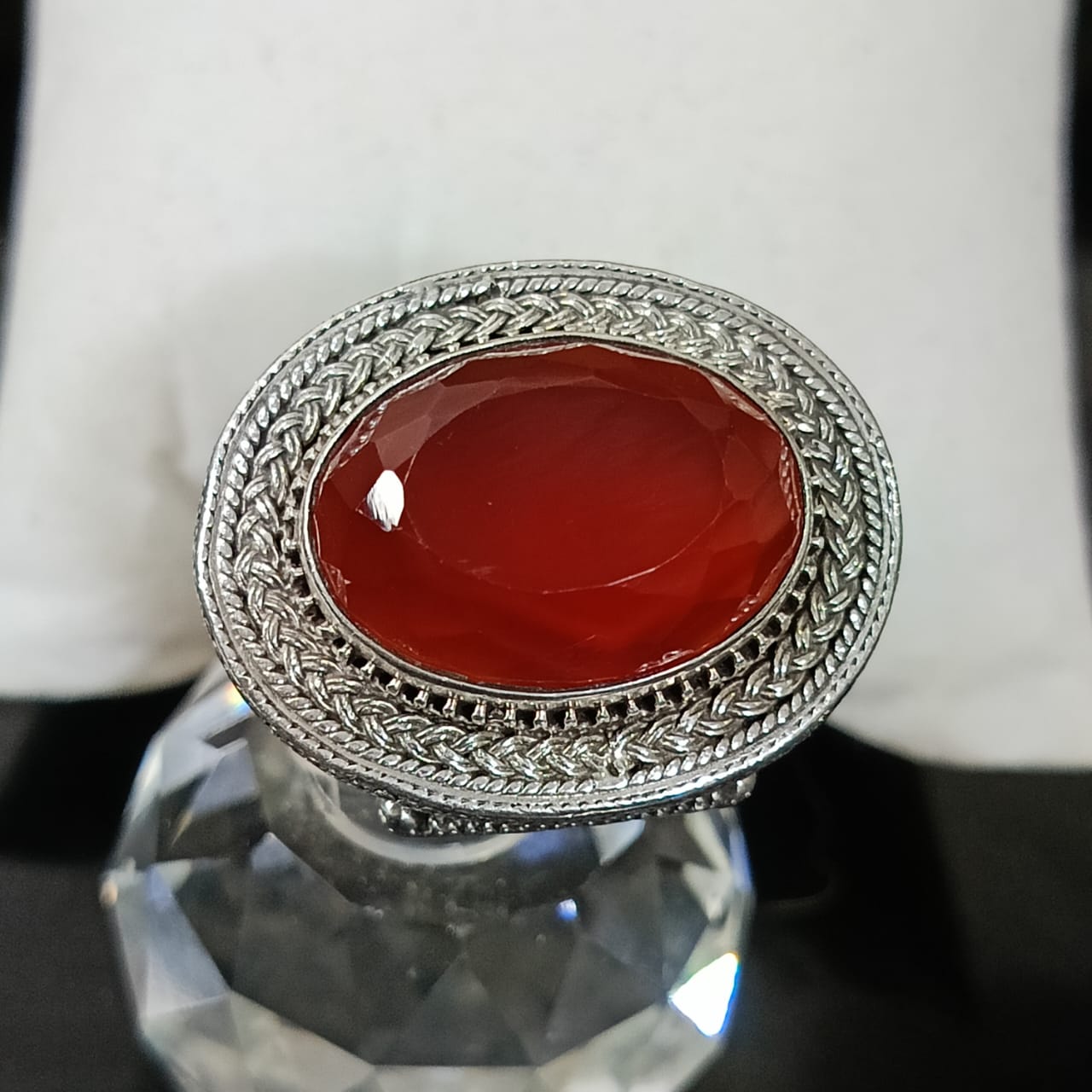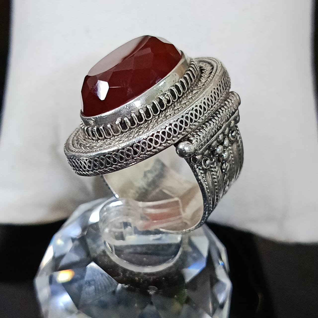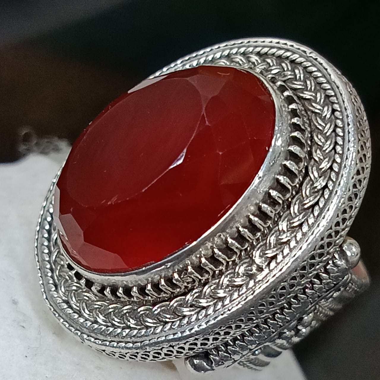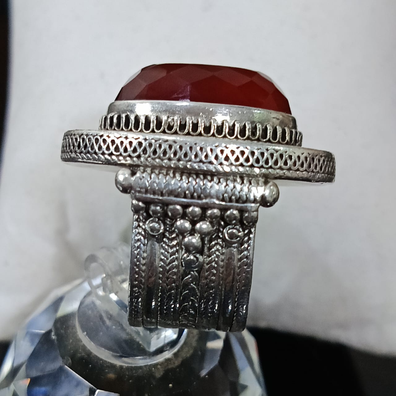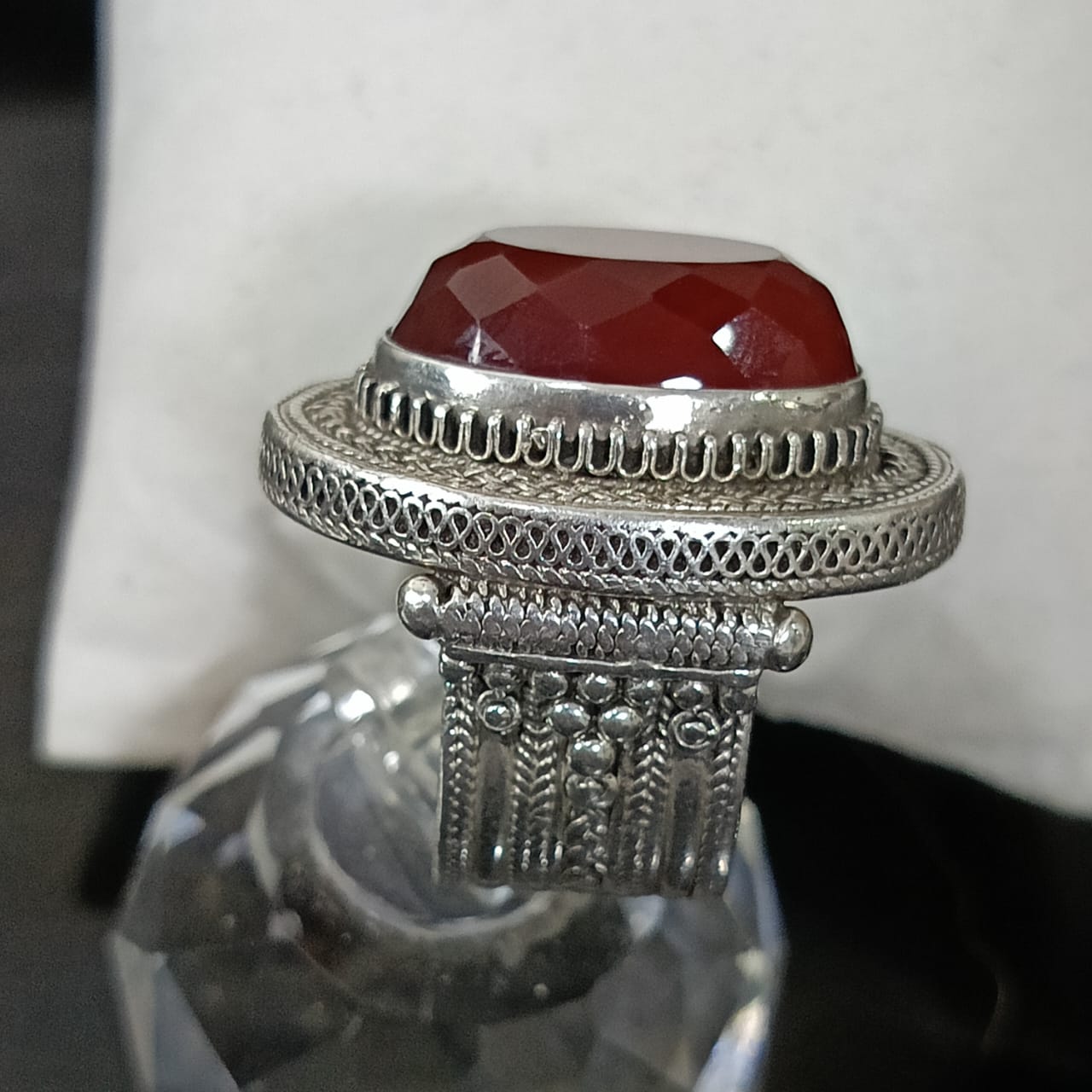 خاتم فضة نادر مميز بحجر عقيق أحمر شفاف طبيعي