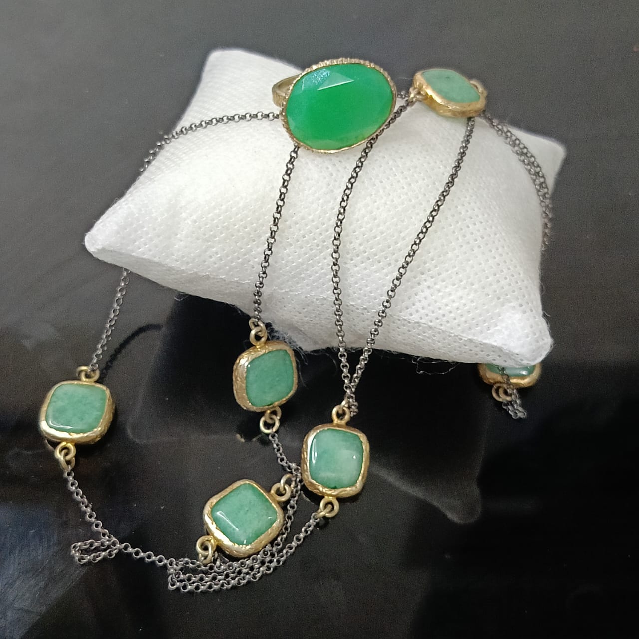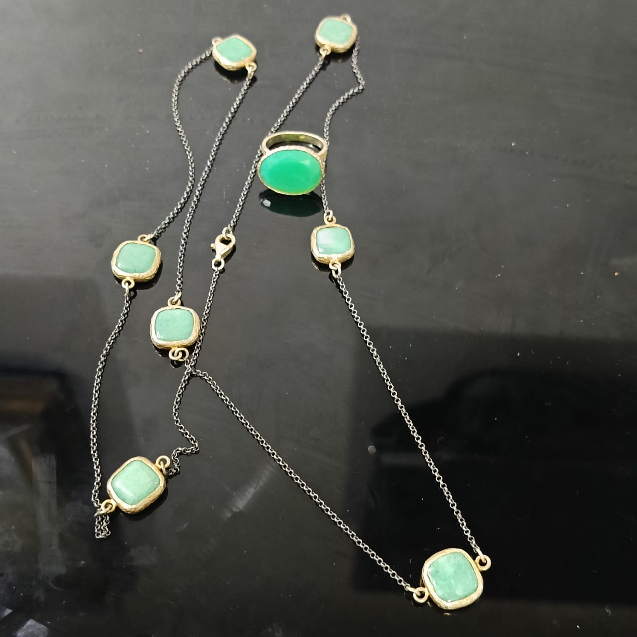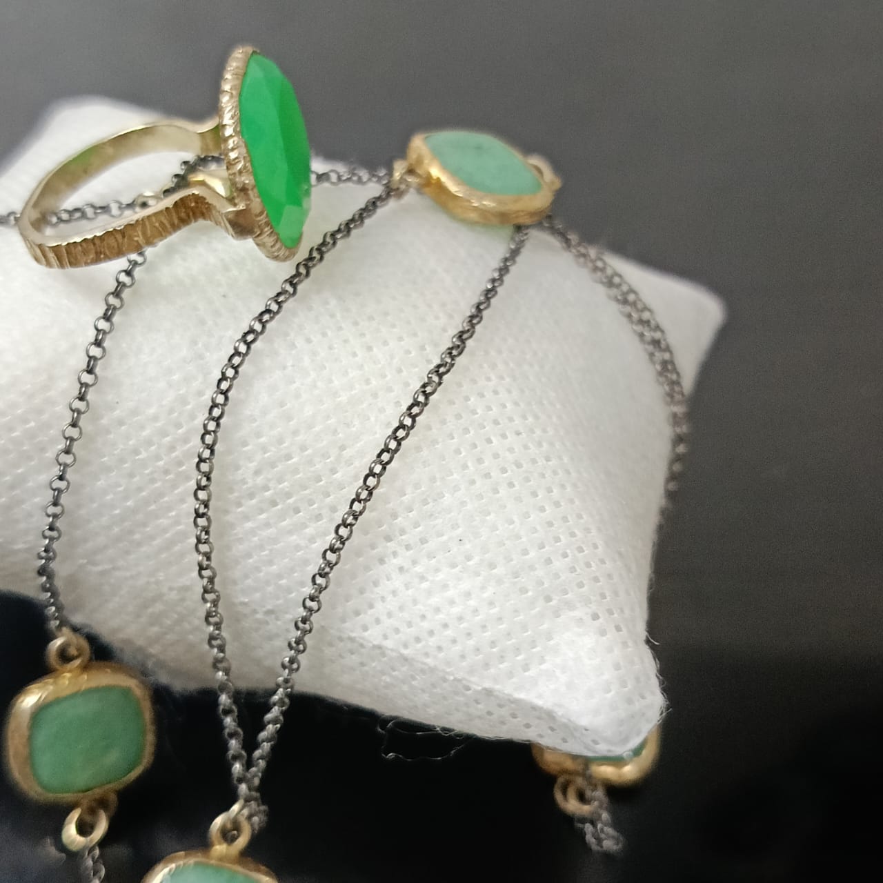 طقم فضة أنيق يضم سلسلة بطول 42 سم وخاتم مزين بحجر الزمرد الأخّاذ. تصميمه الشبابي والمرح يضفي لمسة من الحيوية والتميز على إطلالتك اليومية أو مناسباتك الخاصة. قطعة مثالية لمن يحب التألق بأسلوب فريد ومبهج.